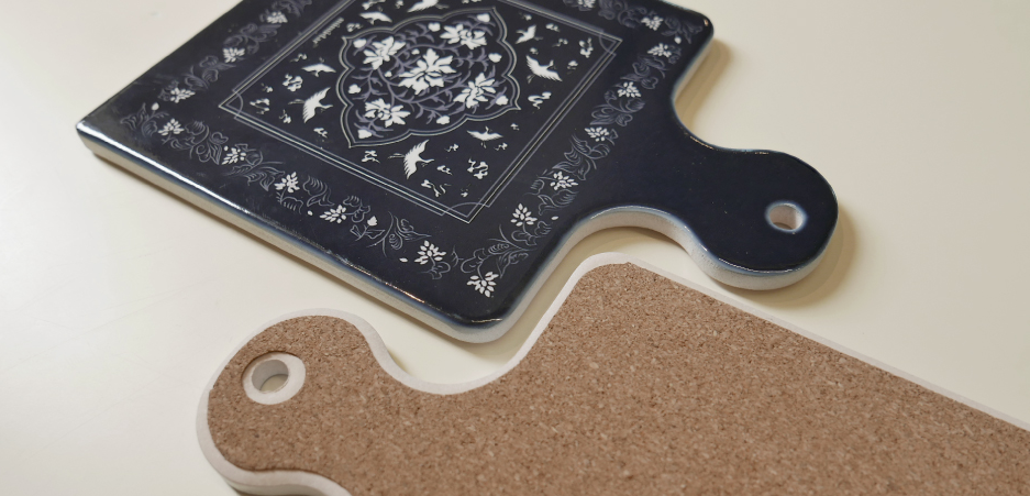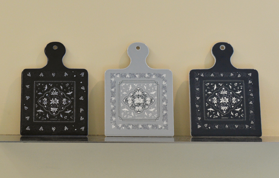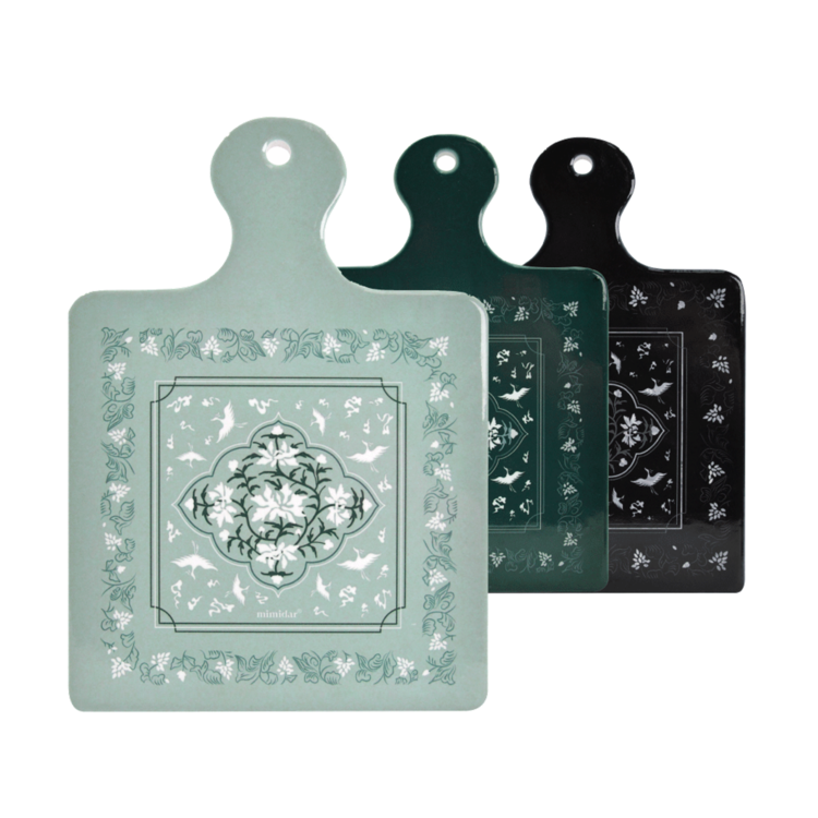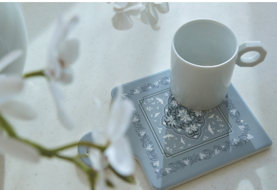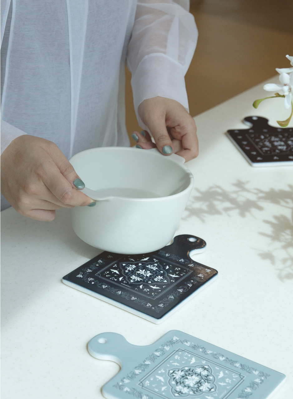 - <셀라던 인 더 하우스>시리즈는 과거, 각 시대의 사회상을 담은 도자기 문화를 재조명합니다. 명확한 용도가 알려지지 않은 유물 '청자 상감 모란 무늬 판'을 현대생활에서 다양하게 사용할 수 있도록 냄비받침으로 재해석 하였습니다.