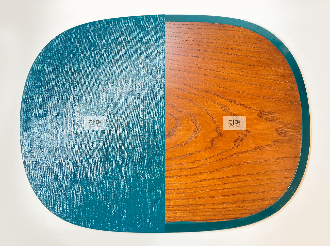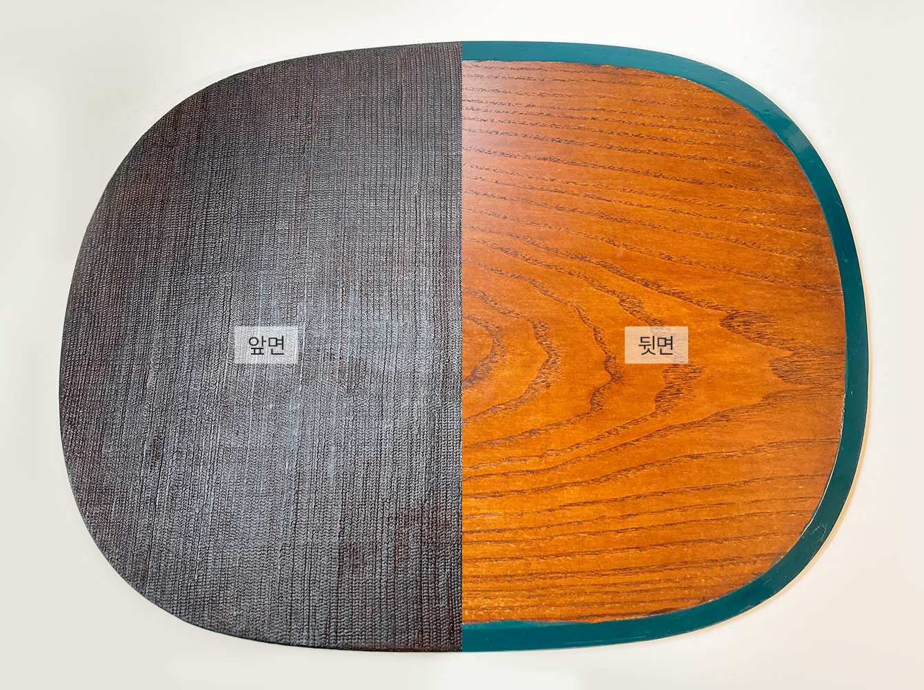 - 한면은 삼베를 입히고, 한면은 원목 그대로 옻칠하여 다양한 상황과 분위기에 맞추어 사용할 수 있습니다. 앞면은 삼베의 거친 질감이 드러나 세련되고 고급스러운 느낌을 주고, 뒷면은 원목 그대로의 결을 살려 자연스럽고 따뜻한 느낌을 줍니다.