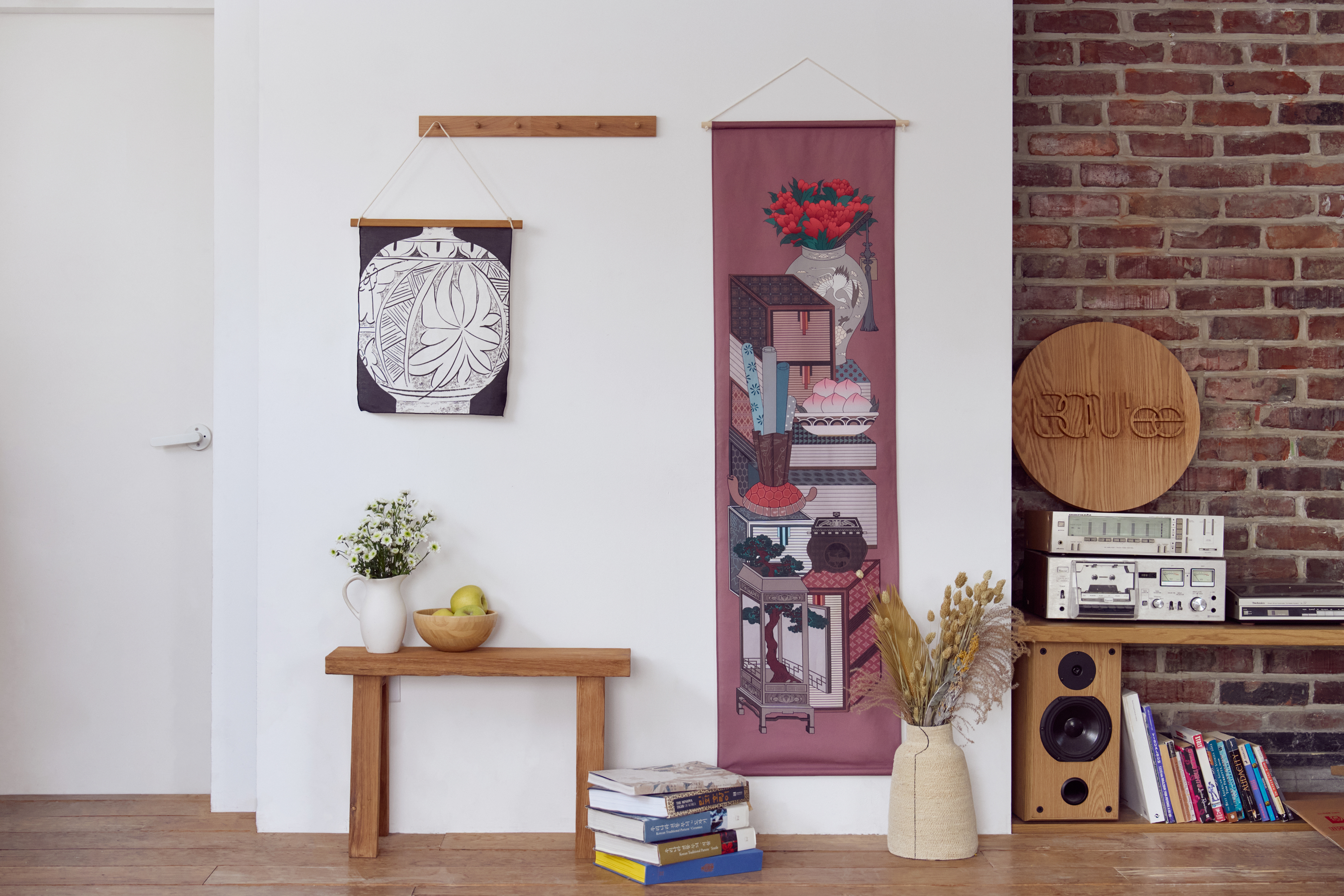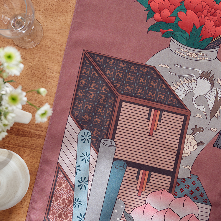 전통 민화를 답습한 그림들은 많지만 전통 민화를 현대적인 구성과 색채로 재해석한 그림은 만나기 어렵습니다. 책거리테이블러너는 현대적인 감각을 더해 전통적인 소재로도 우아한 분위기를 만들어줍니다.