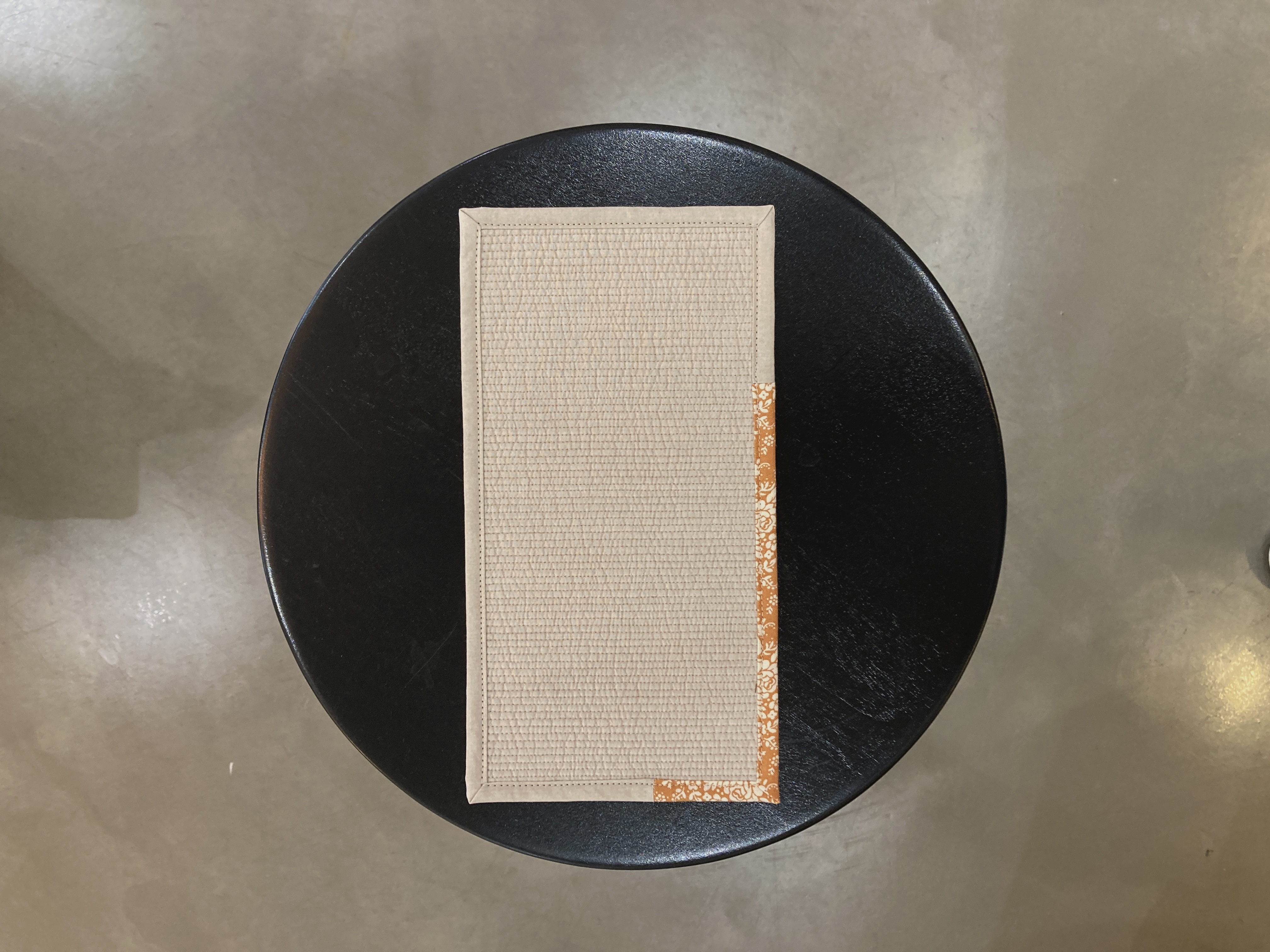This tea mat is made of a dense and sturdy quilted fabric with a strong texture. The edges are decorated with linen for added accents.