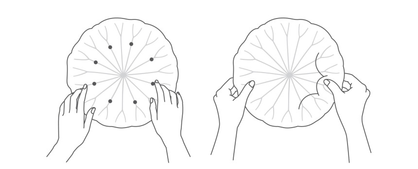 - 한지트레이는 손으로 구부려 형태를 만들 수 있습니다. 위 그림처럼 한손으로 한지트레이를 잡고 다른 손으로 잎맥의 가장자리 부분( 동그라미 표시된 부분)을 안쪽으로 구부려 줍니다.