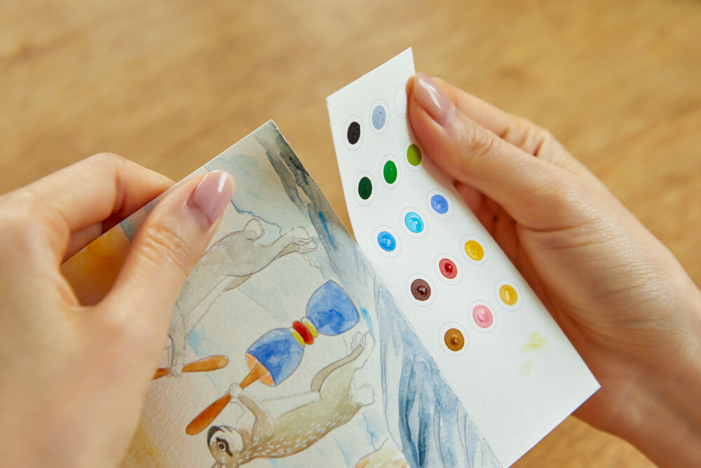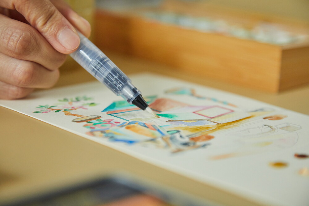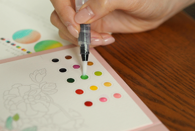 STEP 02 : 워터 브러시를 눌러 붓에 물을 묻힌 뒤, 물감을 발색하세요.