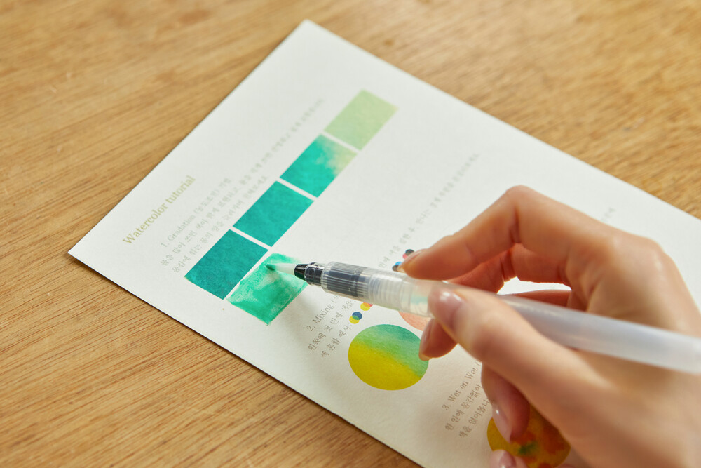 STEP 03 : 튜토리얼을 따라 수채화의 기본 표현을 연습해봅니다. 물을 많이 쓰면 연하게, 적게 사용하면 진하게 발색됩니다. 마르지 않은 물감 위에 다른 색을 덧대어 표현하면 색 혼합 효과를 낼 수 있습니다.