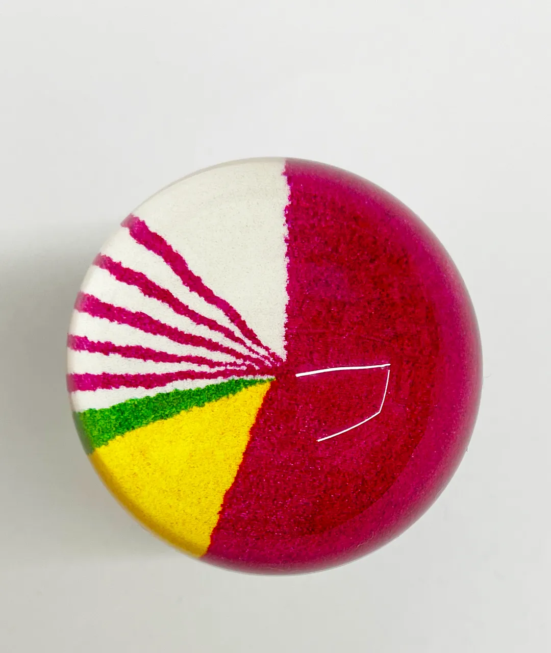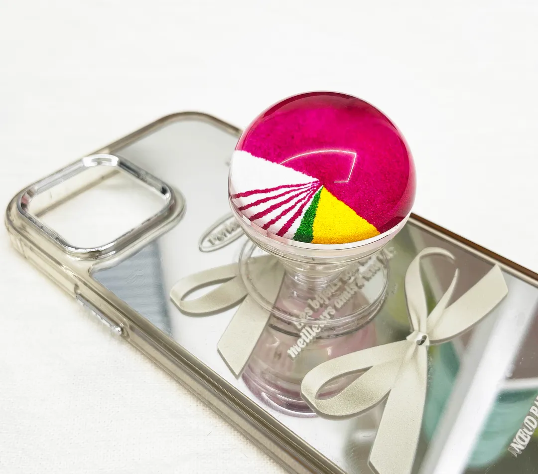 This Okchun candy phone grip features the design of Okchun, a traditional Korean candy. It captures the warm texture of Studio Arok's Okchun rug.